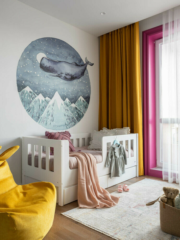 Интересный прием в детской дочери — оформление проема на балкон широким молдингом, выкрашенным в ярко-розовый цвет вместе с откосами и стеной на балконе. Таким же цветом выкрашено «сердце» на стене в комнате.