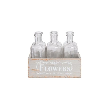 Набор из шести стеклянных бутылок оформлен в искусственно состаренный деревянный ящик. Этот дизайн подчеркивает красоту добротно сделанной вещи, гармонично впишется в интерьер кухни в стиле кантри.