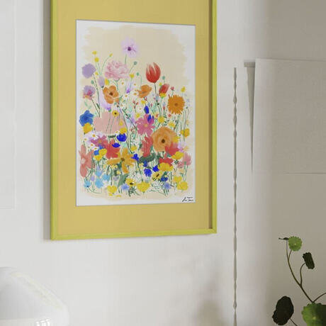 Цифровое произведение искусства, вдохновленное традиционными медиа и тем, как оно может измениться при использовании в цифровом формате. Серия картин по мотивам воображаемых цветочных полей. Плакат поставляется с желтым креплением в желтой деревянной рамке с акриловым стеклом.