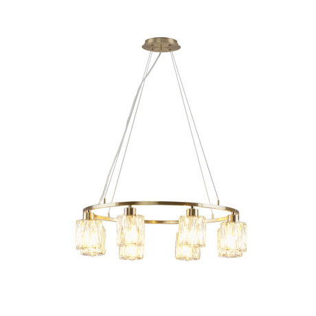 Классическая подвесная люстра Moderli V11685-6P Prismique — выразительность форм и блеск хрусталяВосемь граней элегантности Люстра коллекции Prismique — это гармоничное сочетание симметрии, сияющего хрусталя и благородного металла. Аккуратные хрустальные плафоны в форме прямоугольников равномерно размещены по кругу, создавая эффект объемного и равномерного освещения.Благородный акцент латунного корпуса Металлический каркас с покрытием цвета латунь добавляет изделию изысканности и тепла. Глянцевая поверхность усиливает игру света, а округлая форма основания делает модель визуально лёгкой и современной, несмотря на классический стиль исполнения.Функциональность без компромиссов Восемь патронов E14 обеспечивают мощность до 320 Вт, что позволяет осветить помещение до 18 кв.м. Благодаря регулируемой подвесной системе (высота — от 120 до 180 см), люстра легко адаптируется под разную высоту потолков, включая натяжные.Область применения Эта модель станет выразительным
