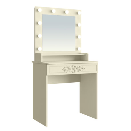 Туалетный столик ТСН-4 – неотъемлемая часть спальни или женской комнаты. Столик не занимая много места, остается вместительным и функциональным, позволяет компактно расставить косметику и парфюмерию, аккуратно сложить украшения и аксессуары. В ящике стола установлены телескопические направляющие полного выдвижения, обеспечивающие его плавный ход. Зеркало оснащено лампами с трех сторон, свет распределяется равномерно, что идеально для ухода за лицом и нанесения макияжа. Зеркало работает от сети, вся электрическая часть с проводкой смонтирована и закрыта задней стенкой. Рекомендуется выбирать светодиодные лампочки с цоколем Е14, мощностью 3-5 Вт и цветовой температурой 4000-4200K (нейтральный белый свет) или 6200K (дневной свет). Фурнитура: телескопические направляющие полного выдвижения без доводчиков. В зеркале присутствует провод (2м) с вилкой, на проводе есть тумблер вкл/выкл.
