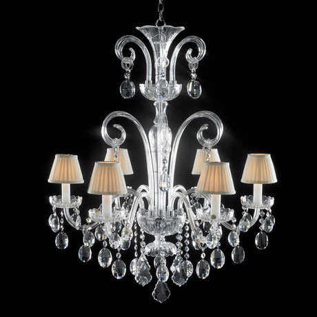 Люстра из коллекции Iri с основанием цвета хром и декоративными подвесками из прозрачного хрусталя. Текстильные непрозрачные абажуры бежевого цвета приглушают свет ламп, направляя его на кристаллы подвесок. Можно изменять высоту за счет укорочения цепи. Подойдет для просторных помещений с высокими потолками. Количество лампочек: 6. Мощность: 6 x 60 Вт. Тип лампы: Накаливания, E14.